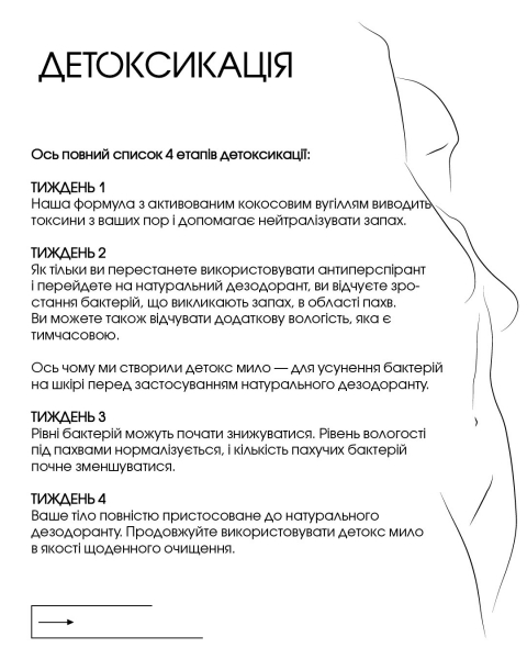 Ваше тіло повністю пристосоване до натурального дезодоранту. Продовжуйте використовувати детокс мило в якості щоденного очищення.