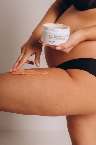 Для профілактики розтяжок під час вагітності найкраще вибирати делікатний скраб з високим вмістом натуральних олій. Зверніть увагу на скраби, що містять м'які абразиви, наприклад, морську сіль, рисову пудру або ніжні рослинні частинки, що допомагають видалити ороговілі клітини, покращують кровообіг і сприяють збереженню еластичності шкіри.