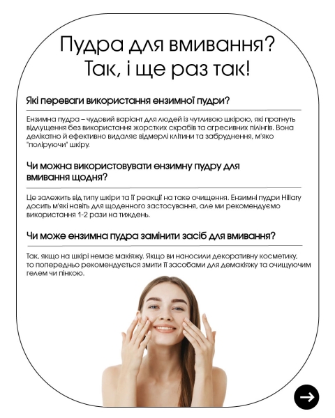 Це залежить від типу шкіри та її реакції на таке очищення. Ензимні пудри Hillary досить м'які навіть для щоденного застосування, але ми рекомендуємо використання 1-2 рази на тиждень.