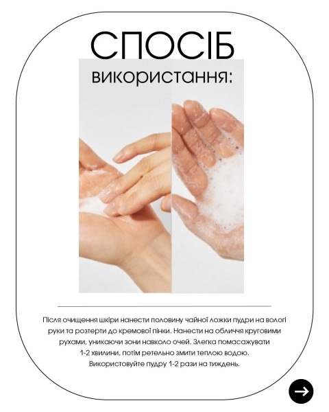 Після очищення шкіри нанести половину чайної ложки пудри на вологі руки та розтерти до кремової пінки.