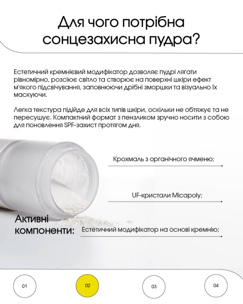 Завдяки тандему сонцезахисних крему та пудри шкіра максимально захищена впродовж дня.