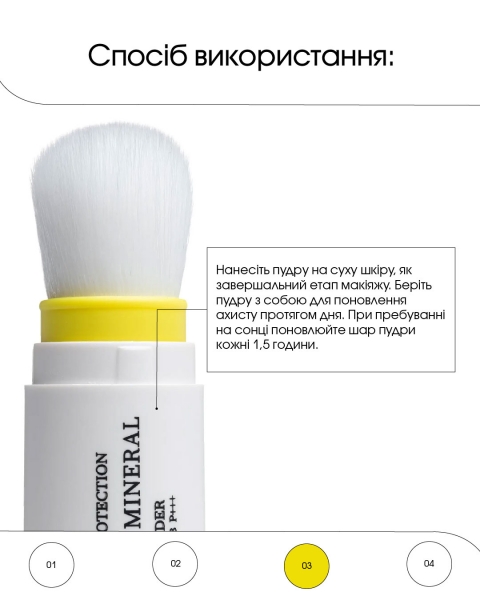 Нанесіть пудру на суху шкіру, як завершальний етап макіяжу. Беріть пудру з собою для поновлення ахисту протягом дня. При пребуванні на сонці поновлюйте шар пудри кожні 1,5 години.