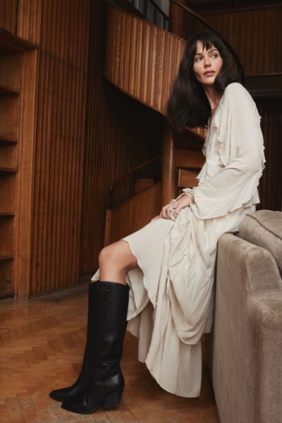 З одного боку, ми маємо романтичні, повітряні силуети, натхненні стилем бохо – сукні з воланами, максі- спідниці та шкіряні сорочки, а з іншого – елегантну простоту з простими, вишуканими формами, такими як довгі пальта, спідниці-олівці та чоботи на шпильках. А для тих, хто краще відчуває чуттєвий стиль, у колекції представлені елементи, що походять з нуар-романтики: мереживна обробка, сукні-комбінації з білизни та виразні туфлі на шпильках. Такі тканини, як шкіра, шифон і модний трикотаж, забезпечують комфорт і якість, підкреслюючи при цьому жіночу силу і незалежність.