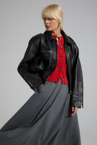 Важливо відзначити, що куртки-косухи все ще залишаються в тренді, і Prada показує, як використовувати шкірянку в жіночних весняних образах. Вас не переконав цей тренд? Придбайте позачасову косуху чорного кольору, адже цього року вона знову буде надзвичайно популярною.