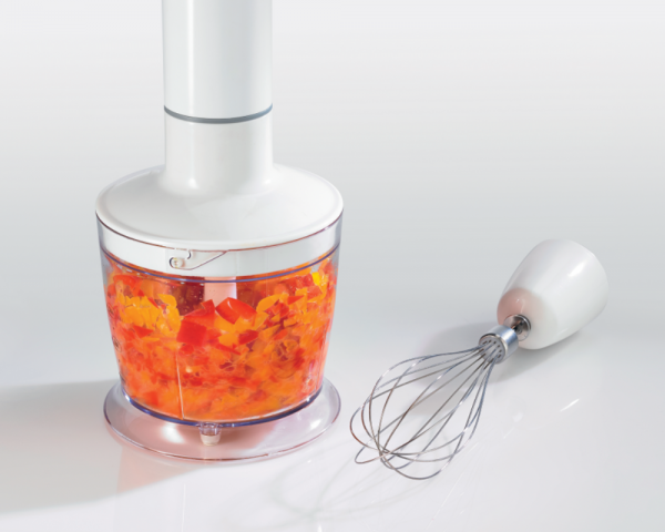 Основні переваги: занурювальний блендер, потужність 1000 Вт, чаша подрібнювача 0,5 л, мірний стакан 0,6 л, плавне регулювання швидкості.